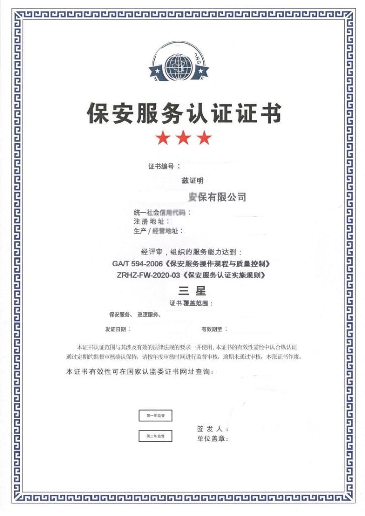 GA/T594-2006保安服务认证证书适用于(1)保安服务公司;(2)物业服务企业招用人员在物业管理区域内开展的门卫、巡逻、秩序维护等服务;(3)机关、团体、企业、事业单位招用人员从事的本单位门卫、巡逻、守护等安全防范工作。